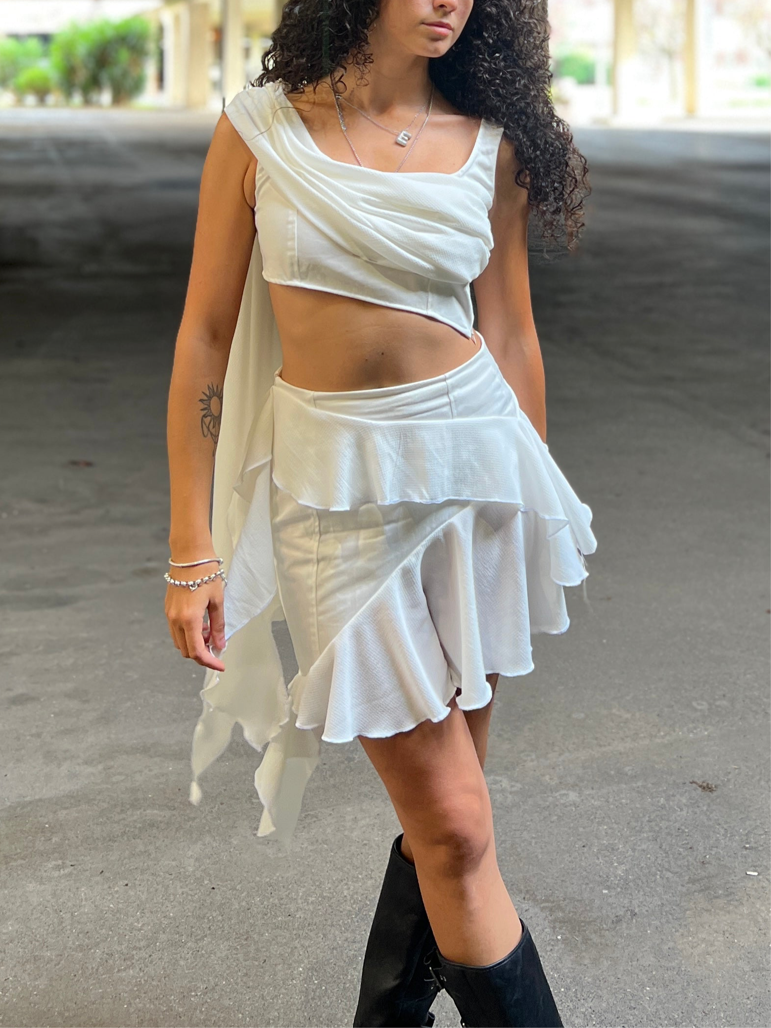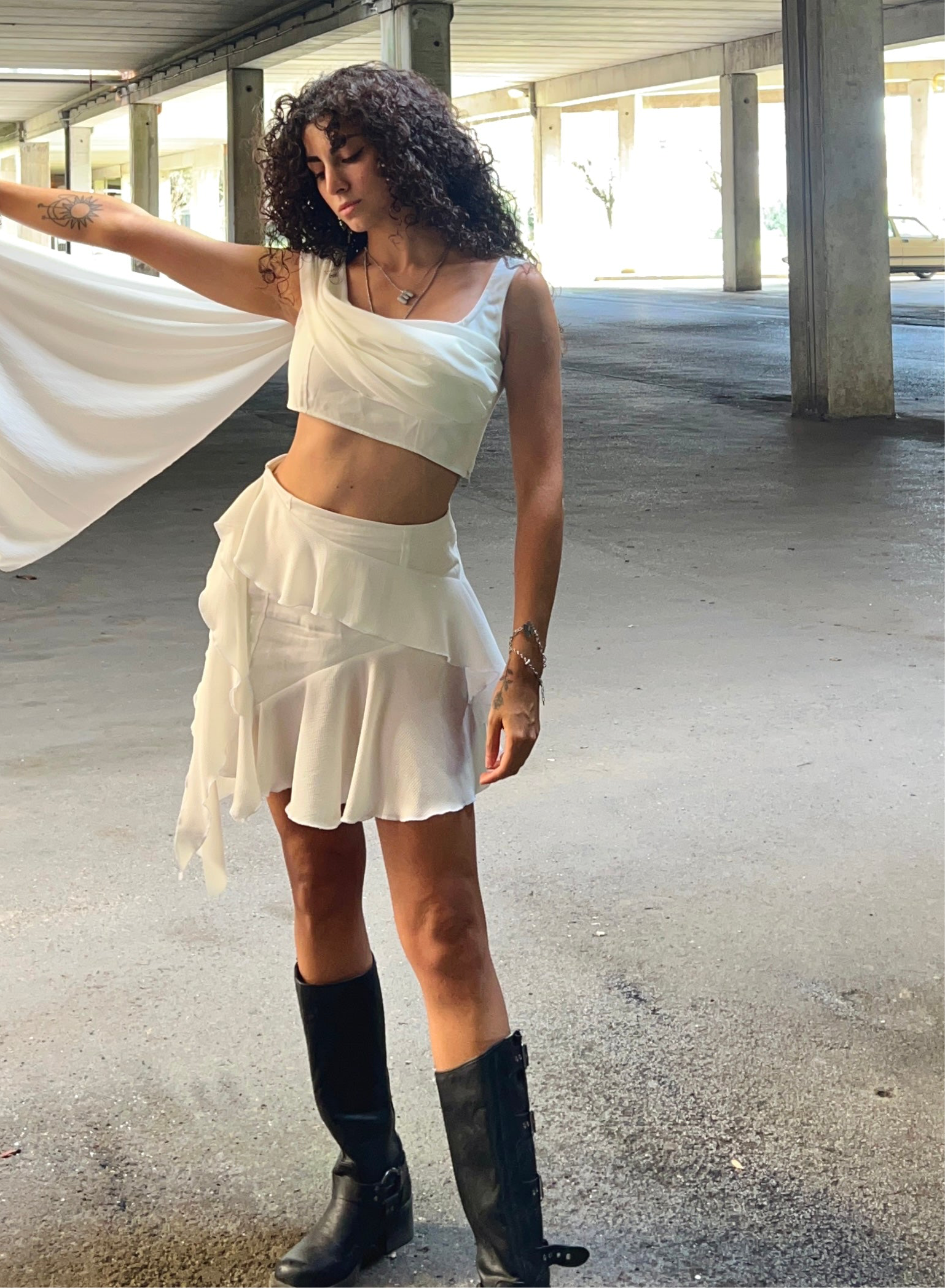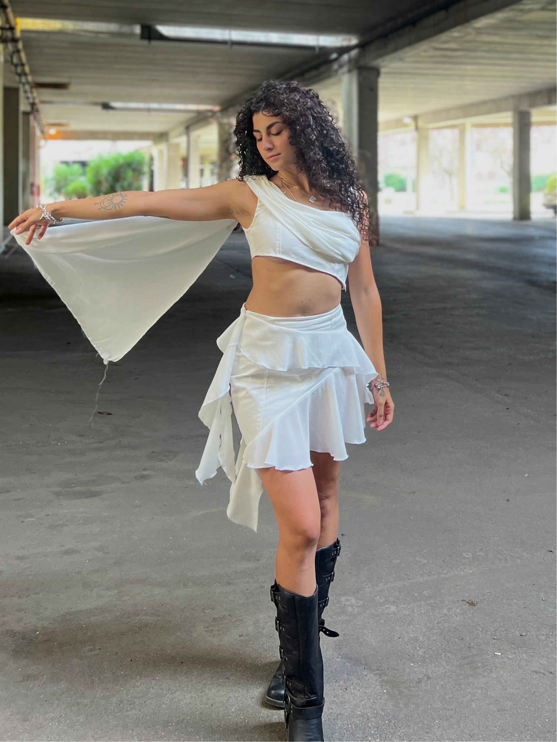 Crop top asimmetrico: realizzato in cotone, con drappeggi di chiffon sul davanti che si trasformano in una lunga sciarpa sul retro, creando dinamismo e grazia ad ogni passo.