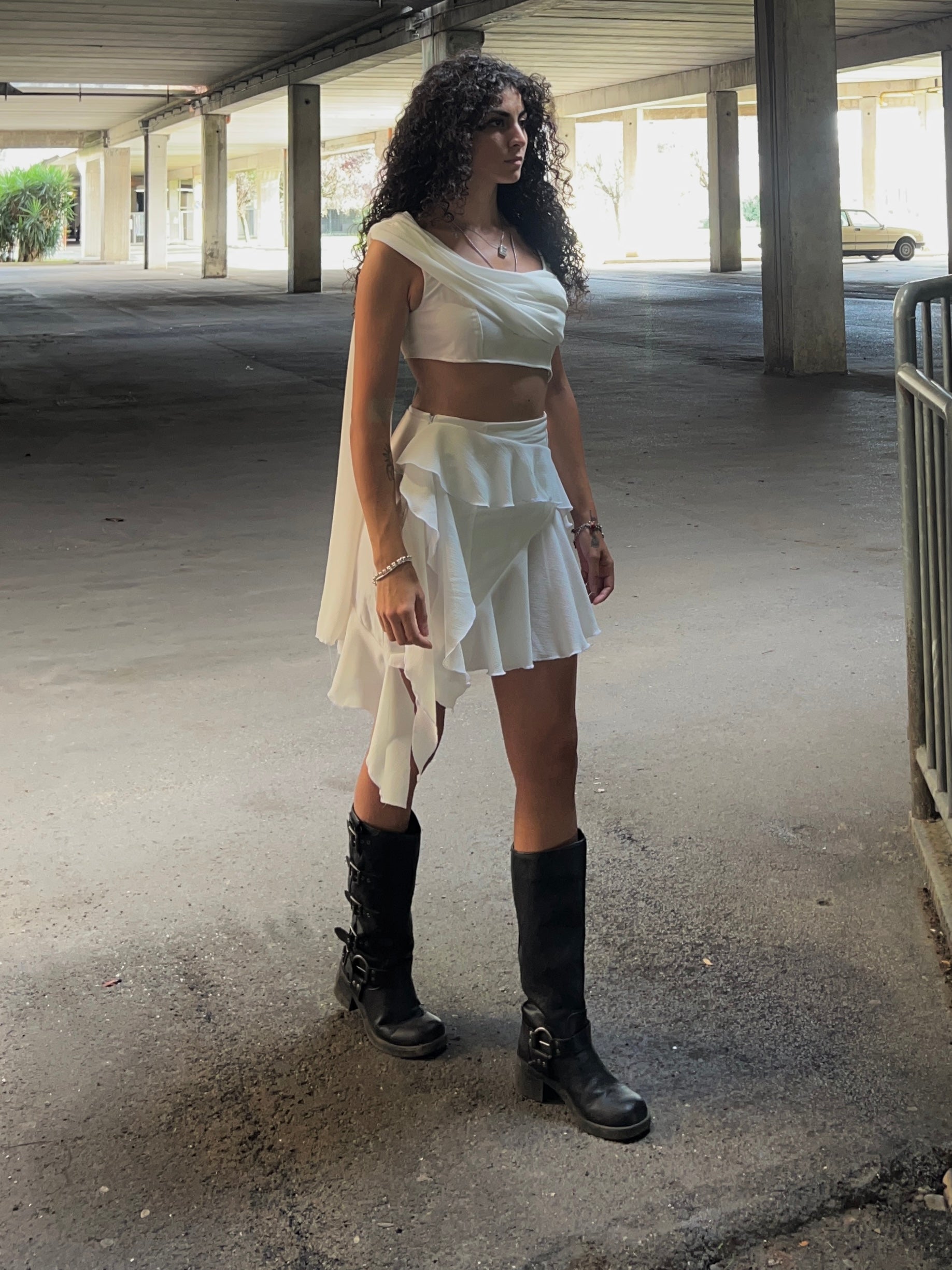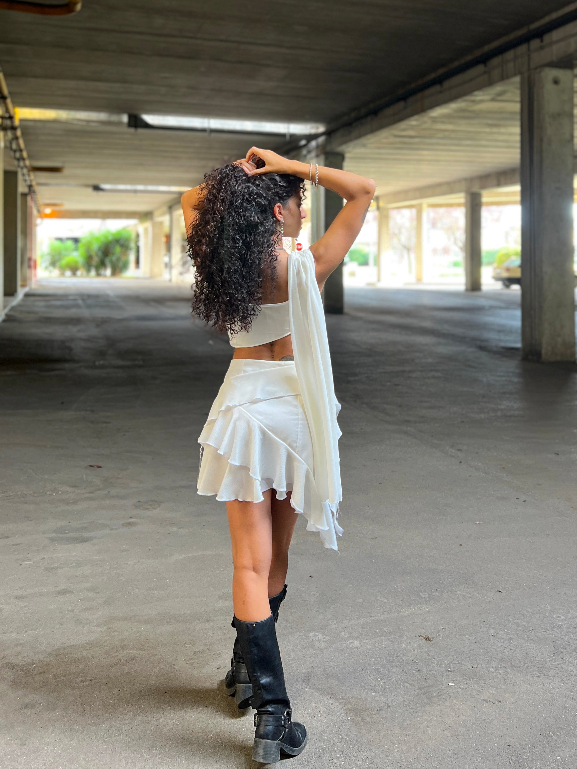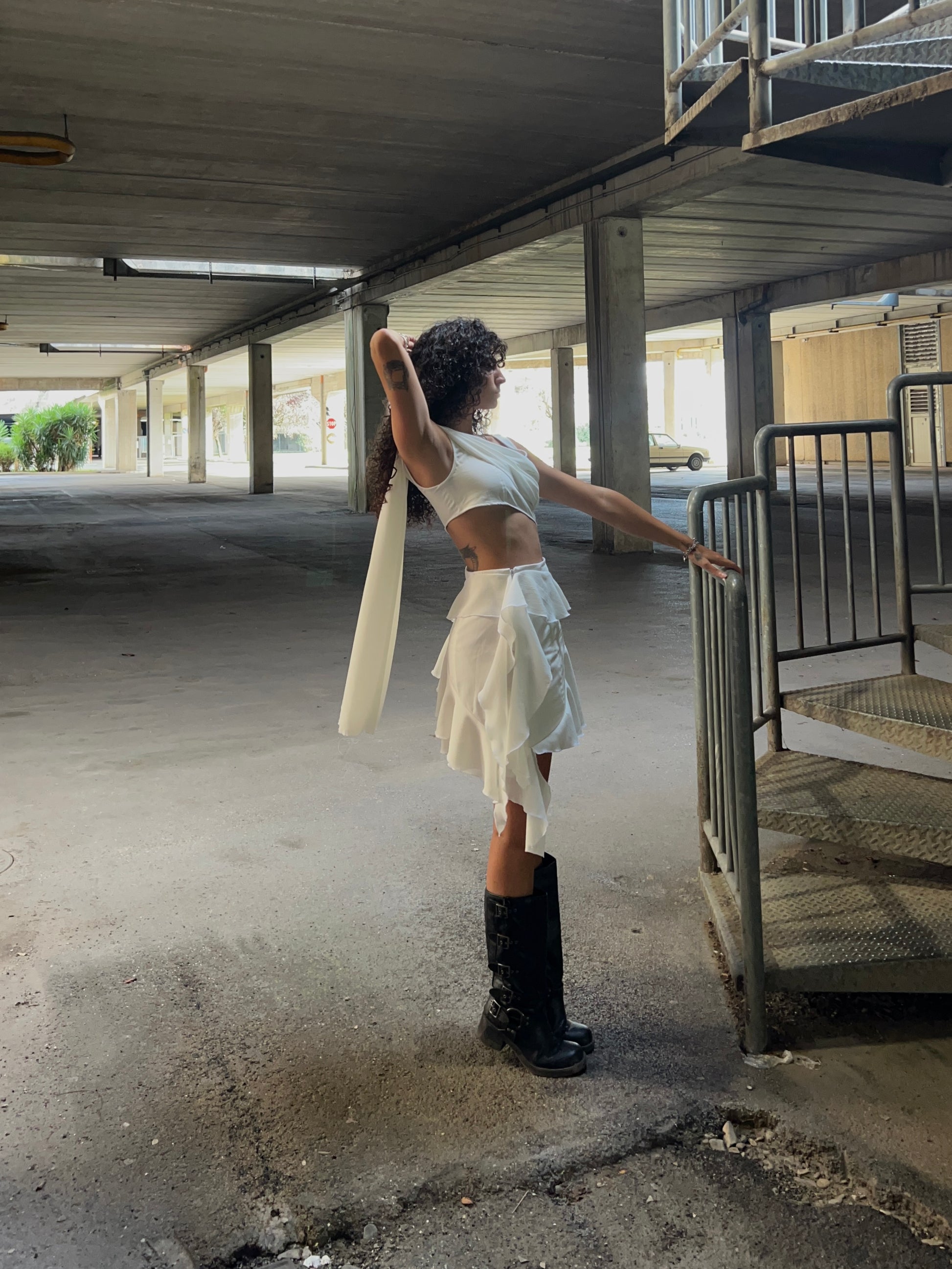 Crop top asimmetrico: realizzato in cotone, con drappeggi di chiffon sul davanti che si trasformano in una lunga sciarpa sul retro, creando dinamismo e grazia ad ogni passo.